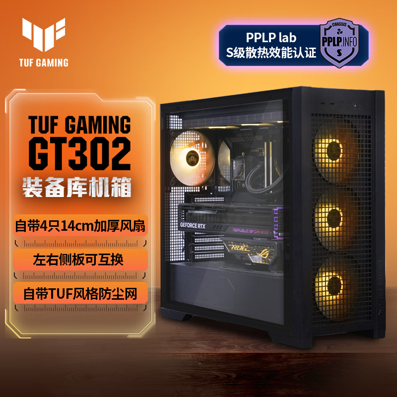 华硕 GT302 装备库机箱 黑色 背置BTF 2.0/14cm加厚ARGB风扇/附防尘网/强散热/左右侧板互换