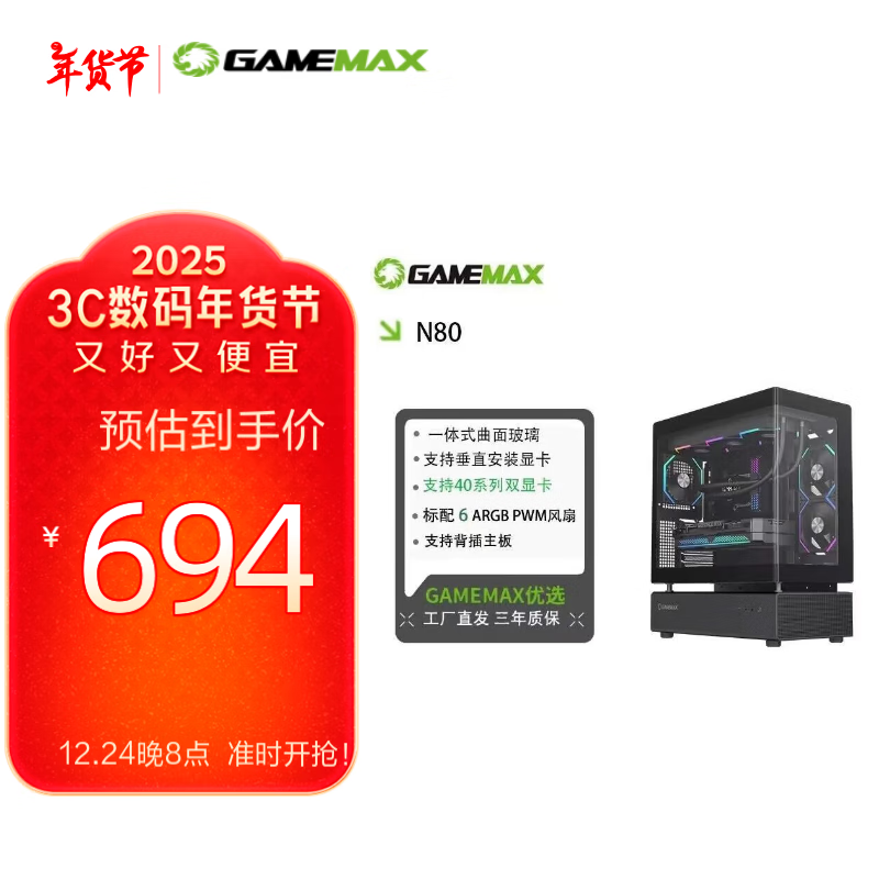 游戏帝国 N80台式电脑机箱ATX搭配6风扇支持垂直安装显卡 背插主板 支持双40系列显卡 曲面玻璃/黑色