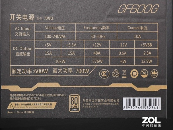 金河田 GF600G电源的额定功率为600W,电源通过了80 PLUS金牌认证,单路12V输出达到了48A即576W,对于发烧级的双卡平台也可以轻松应对,我们通过实测来看这款电源的表现。