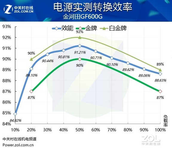 首先是转换效率测试,金河田 GF600G电源表现良好,电源通过了80 PLUS金牌认证,在实际测试中各路负载下都达到了金牌效能,但实测50%负载时转换效率为91.21%,没有达到官方宣传的91.31%,应该是误差所致。