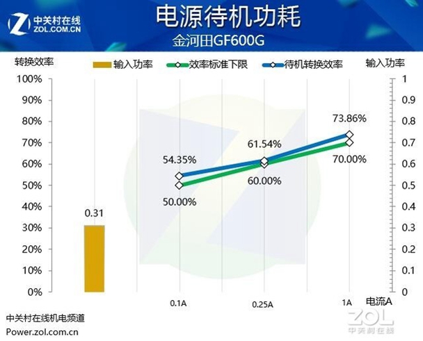 金河田 GF600G电源的待机转换效率也表现良好,电源的待机效率高出标准,低至0.31W的待机功耗也是很好的表现。