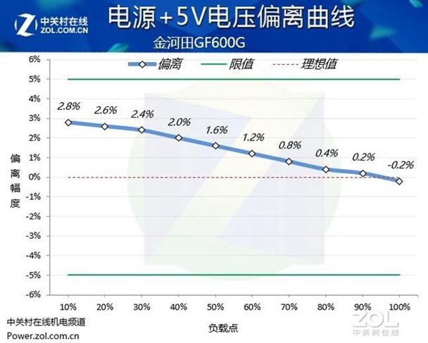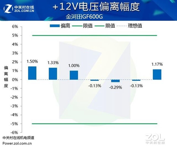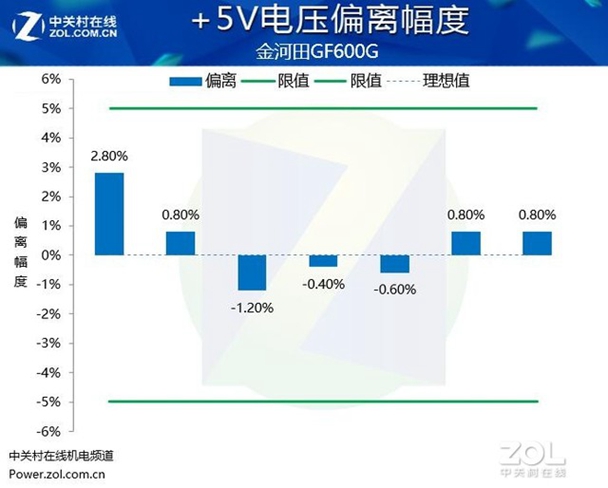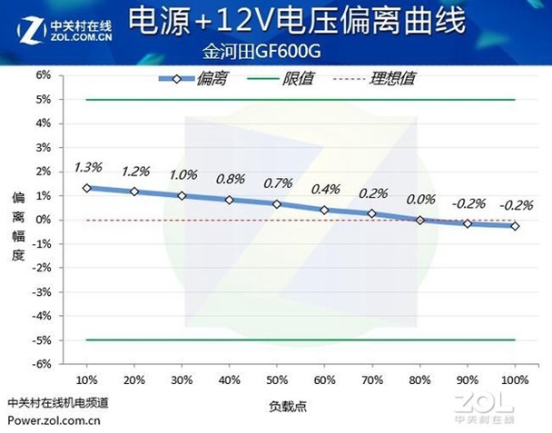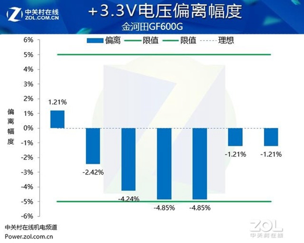 在电压偏离测试中,金河田 GF600G电源的各路电压偏离控制在4%的偏离幅度内,算是良好的水平。