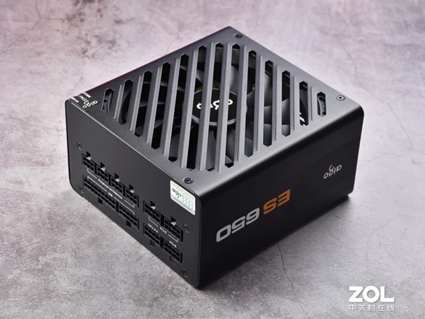 爱国者 ES650电源在外观上采用了创新的设计风格,尤其是风扇位的镂空设计让人眼前一亮,可以说是非常具有设计风格,主要配色则和包装一样采用了黑色和暗金的搭配,整体的质感也是很到位的。