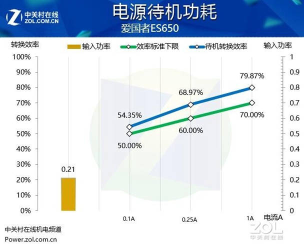 爱国者 ES650电源的额定功率为650W,可以为单卡旗舰平台提供用电支持,电源经过80 PLUS金牌认证,在实际测试中表现良好,各项转换效率可以达到金牌效能,满载转换效率可以达到白金效能。电源的待机功耗只有0.1W,整体的节能效果也很好。