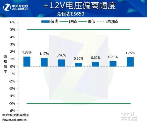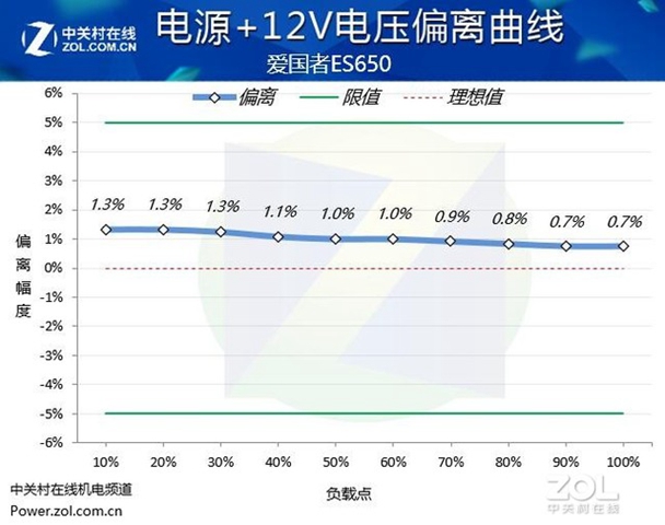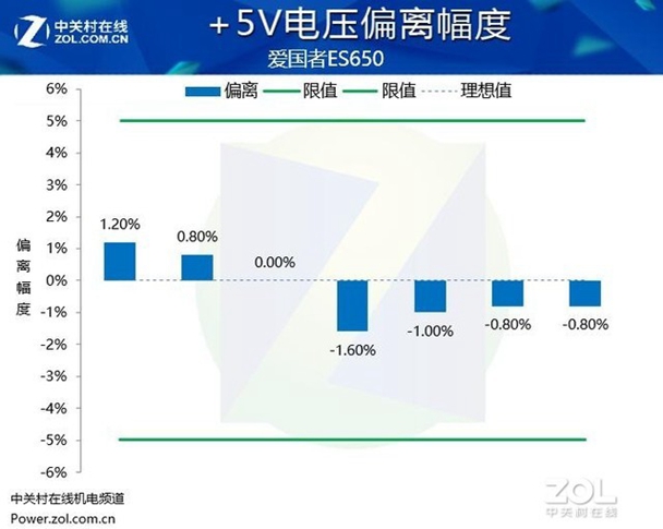 在电压偏离测试中,爱国者 ES650电源达到出色水平,各路输出电压偏离全部控制在2%的幅度内,属于说明各路的电压输出非常稳定。