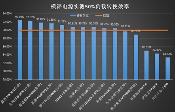 本次横评的电源中有2款标注了白金牌,10款金牌,2款铜牌产品,鉴于很多玩家在购买时会看80 PLUS,Z监制对电源的要求是50%负载下转换效率达到90%,我们也借此机会对比一下。