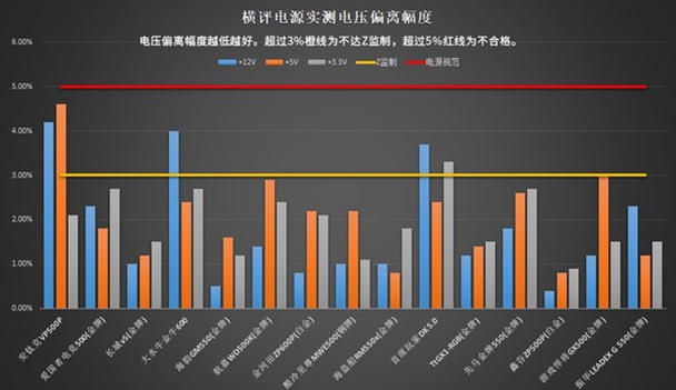 从测试结果来看,横评的15款电源全部合格,都控制在5%的合格线内,其中还有12款电源的电压偏离低于3%符合Z监制要求,也是不错的表现。