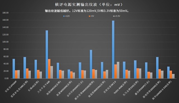 最后一个对比的项目是输出纹波,也就是电源输出电流的纯净度,这个数值同样是越低越好。电源标准对纹波的限值是12V纹波120mV,5V和3.3V的纹波50mV。