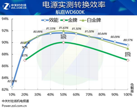 在转换效率方面,航嘉 WD600K电源有很好的表现,这款产品通过了80 PLUS金牌认证,实际测试中在不同负载下也都达到了金牌效能,在满负载时达到了白金牌效能,节能效果还是很好的。