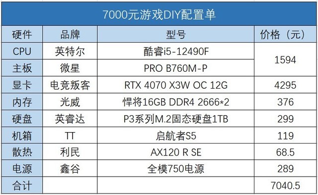 机箱的选择没什么问题,没有特殊需求的话机箱也不需要特别花哨,散热器其实百元左右的4热管也可以应对12390F的发热量,全套下来7000元还是可以拿下RTX 4070的。