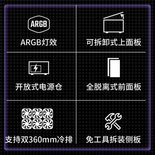 在灯光设计方面,酷冷至尊 毁灭者500加入了ARGB灯条,并与主板实现光效同步,让用户可以自由控制灯光效果。此外,预装的ARGB风扇也能与机箱前部上下呼应,营造出科幻图腾风与未来科技氛围感。