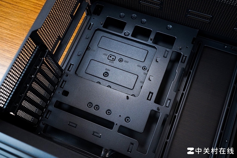 后部I/O模块右侧预留120mm液冷散热器安装位,也可换装120mm散热风扇。顶部预留了360mm冷排的安装位置。扩展部分为7个PCIe拓展槽位,均采用螺丝固定的可拆卸式,不仅拆装方便,安装显卡也不用到处找螺丝了。电源安装位采用主流的下置设计,并做成独立舱位。