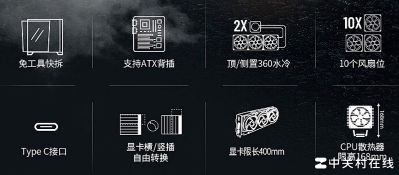 航嘉MVP Destiny天命人是一款ATX机箱机箱,支持最新的ATX背插主板,还向下兼容mATX和mini-ITX主板,还支持ATX背插主板。整体采用模块化设计,拆装非常方便,内部支持最高168mm的CPU散热器以及400mm以下的显卡,还支持显卡横/竖插自由转换。除此之外,这款机箱还拥有10个风扇位,散热性能直接拉满。