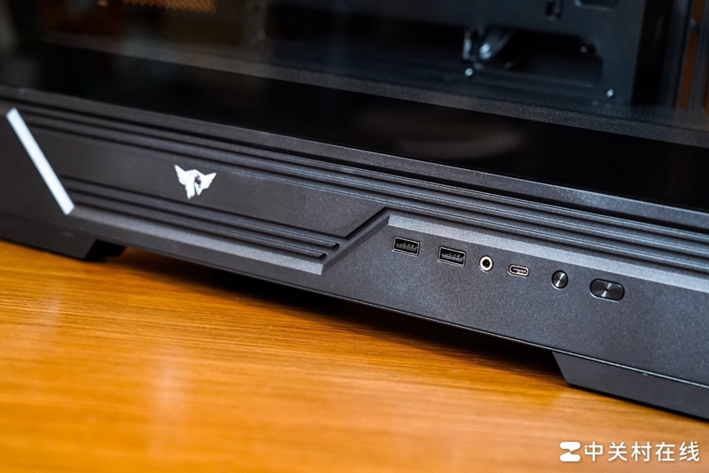 前部接口按键在底部左前方,对于将主机放在桌面上的用户来说操作起来更方便。配备2个USB3.2 Gen1 Type-A接口、一个1个3.5mm耳机/麦克风复合接口、一个USB3.2 Gen2 Type-C接口。按键方面,圆形的是复位,跑道形状的是电源,内部嵌电源指示LED。
