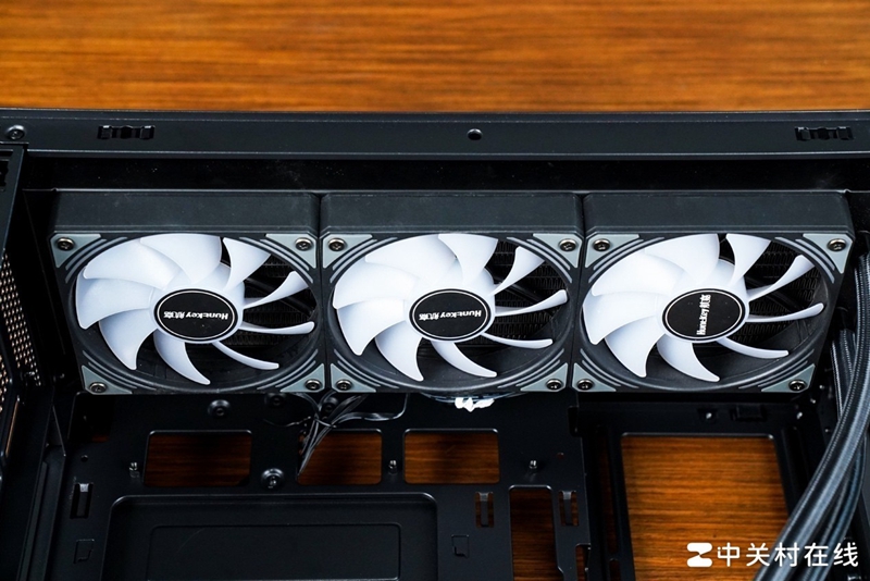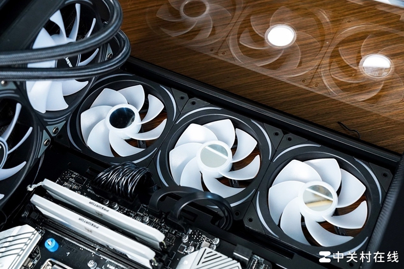 机箱顶部安装水冷的冷排,我们选用的是航嘉MVP V360 360mm一体式水冷散热器,记得要将风扇的电源线和RGB灯光线方向向下,便于从机箱背板穿线隐藏,水管的方向要朝向前方。