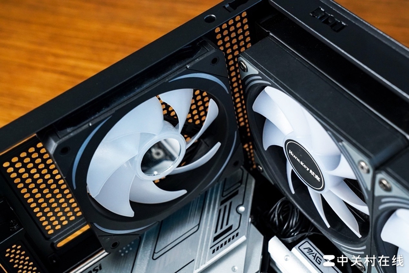 主板前方安装三个航嘉MVP 120F小宇宙RGB散热风扇,而且这三个风扇是反叶的,提供正确风向的同时,通电后还会有更好的视觉效果。