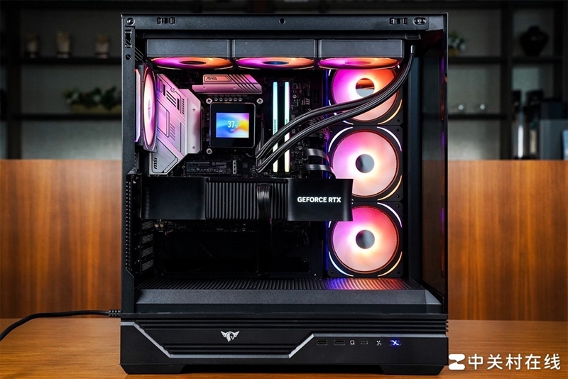 最终完成的效果,宽裕的空间带来极佳的散热效果,搭配航嘉RGB液冷散热器和RGB的内存主板可带来绚丽的灯效,在主板的灯光控制软件中还能设置灯光的同步效果。