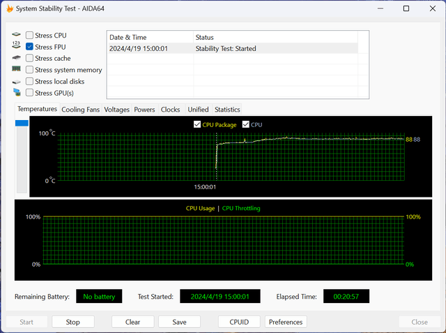 开启Stress FPU“单烤”,酷睿i9-14900K基本处于满载状态,散热器冷排风扇也开启了暴走模式,此时CPU温度基本恒定在88℃。