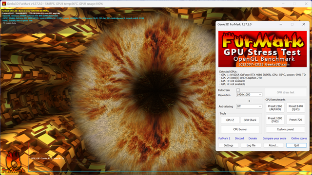 RTX 4080 SUPER显卡满载测试,在俗称的“甜甜圈”FurMark中选用1080P模式即可实现98%以上的TDP,此时显卡的风扇也开启了暴走模式。