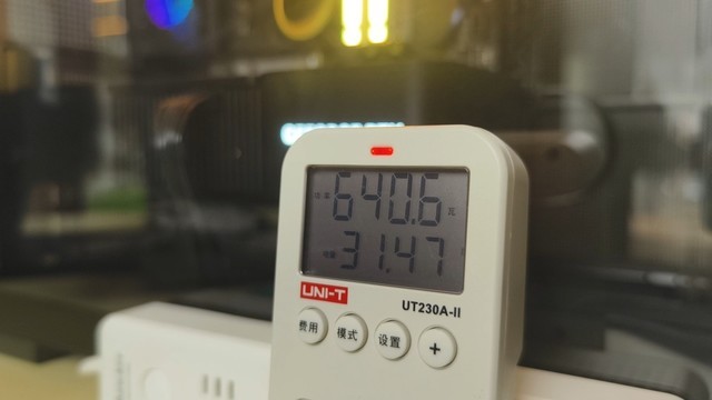 整机功耗方面,功率仪显示基本在640W上下浮动,虽然这种极端满载的情况基本不会遇到,但也不建议铤而走险使用650W的电源。