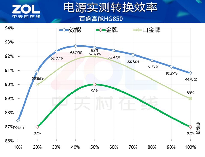 首先是转换效率测试,百盛高能HG850电源表现出色,电源通过了80PLUS金牌认证,在实际测试中各路负载下都超过了白金牌效能,有出色的节能表现。