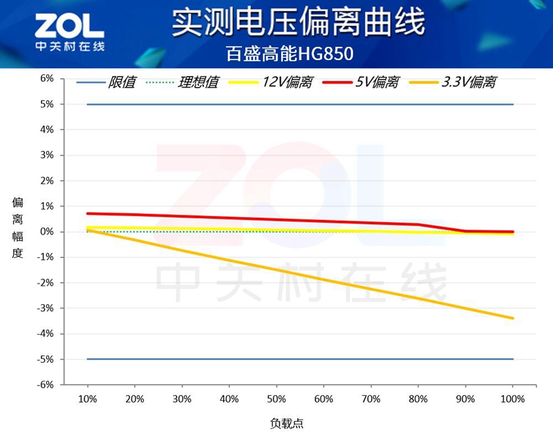 在电压偏离测试中,百盛高能HG850电源的+12V和+5V电压偏离都控制在了1%的幅度内,+3.3V电压控制在3%的幅度,远优于5%的电源规范限值,表现优秀。