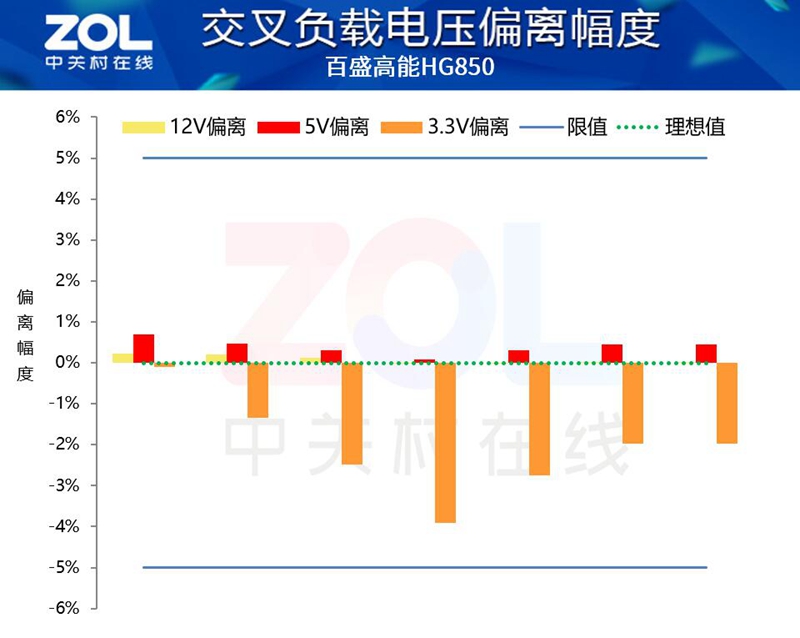 在接下来的交叉负载测试,百盛高能HG850电源同样表现优秀,+12V和+5V的电压输出稳定,+3.3V电压控制在4%的幅度,同样优于5%的电源规范限值。