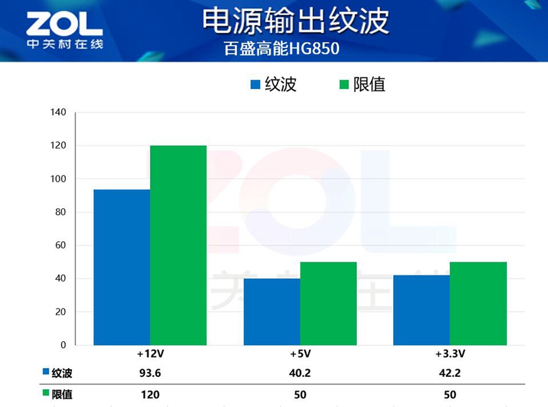 最后的纹波测试中,百盛高能HG850电源的输出纹波也都低于限值,说明这款电源在输出端的表现同样值得肯定。