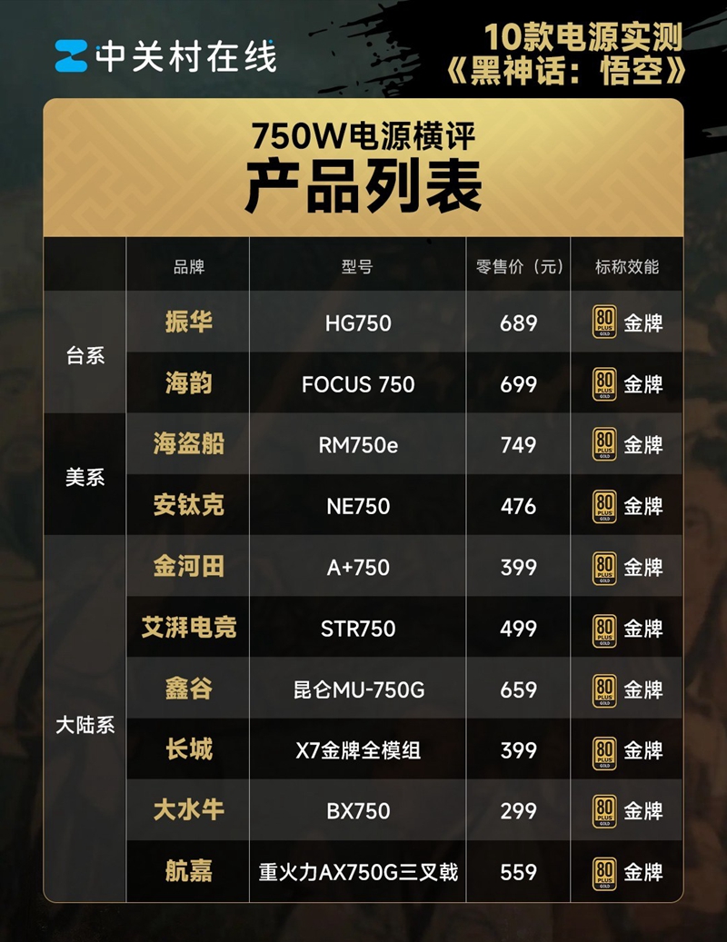 考虑到大多数玩家的预算和使用需求,本次电源横评我们从京东商城采购了10款750W的金牌全模组电源,并通过实机运行《黑神话:悟空》来看看不同产品的表现。