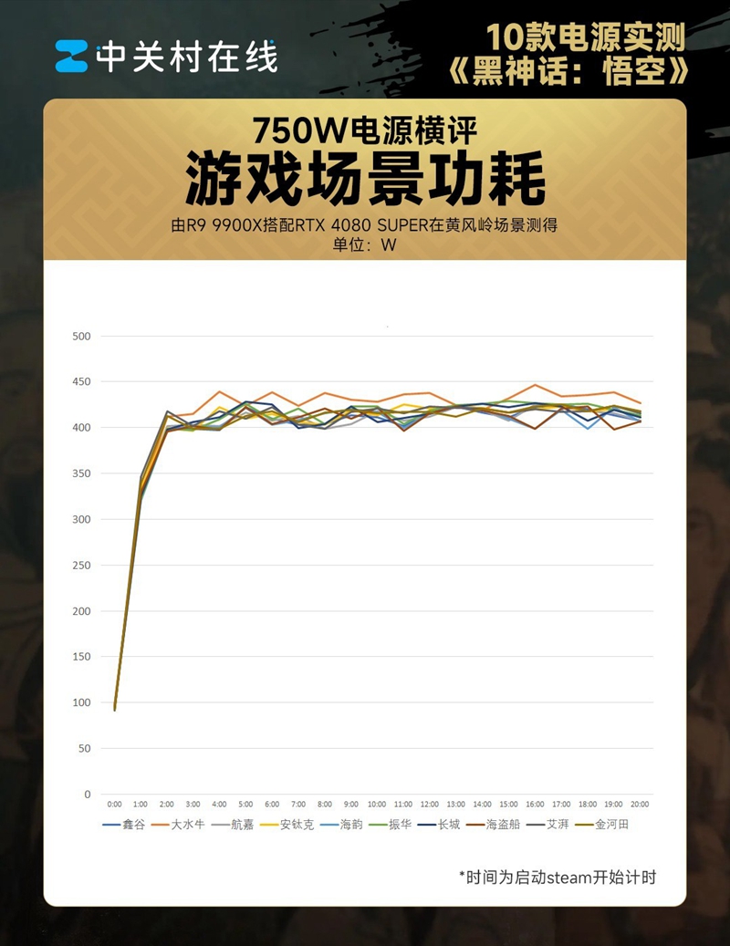 首先我们进行《黑神话:悟空》的实机测试,测试平台为AMD的R9 9900X搭配RTX 4080SUPER,然后将电源连接到功耗仪上进行游戏测试,测试的环境温度为27℃,湿度为40%RH,每款电源均在黄风岭这个场景进行20分钟的测试,每分钟记录一次功耗。