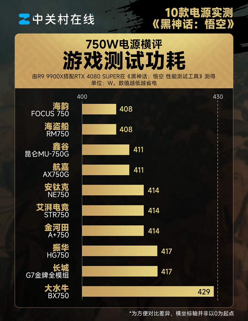 结合我们测得的平均功耗,10款电源中耗电量最低的是海韵的FOCUS750和海盗船的RM750,平均功率只有408W,而耗电量最高的则是大水牛的BX750,平均功率为429W。游戏方面的实测数据只是让大家更好地了解游戏时电源的运行情况,性能测试部分我们还是用专业的仪器进行测试。