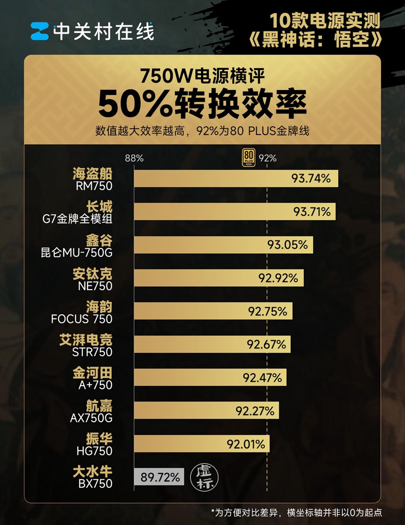 电源规范没有对转换效率做出要求,不过本次横评的10款电源都标注了80PLUS金牌认证,那么金牌效能就是转换效率测试考量的指标。