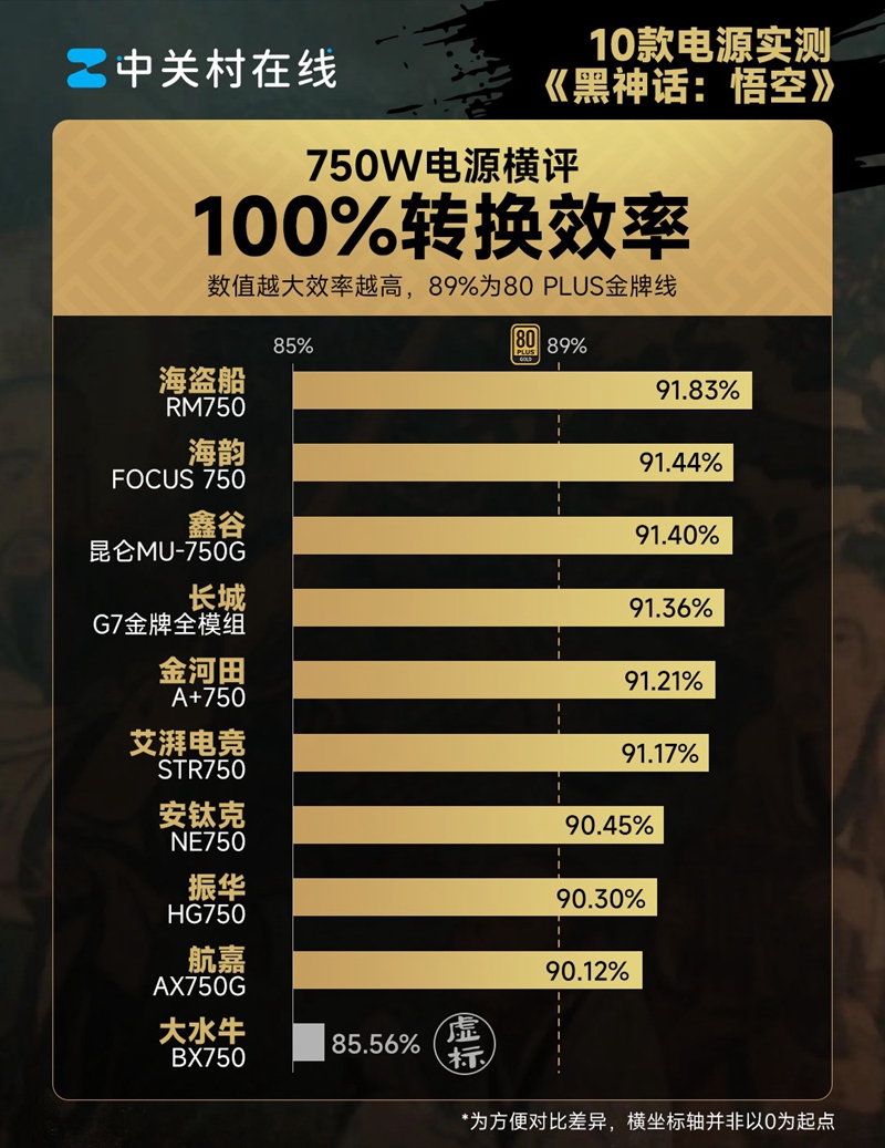 从测试结果来看,这几款电源都有不错的节能表现,和我们在《黑神话:悟空》的实机测试中表现基本一致,另外,大水牛的电源在50%负载和100%负载时都没有达到标称的效能,属于虚标80PLUS认证。