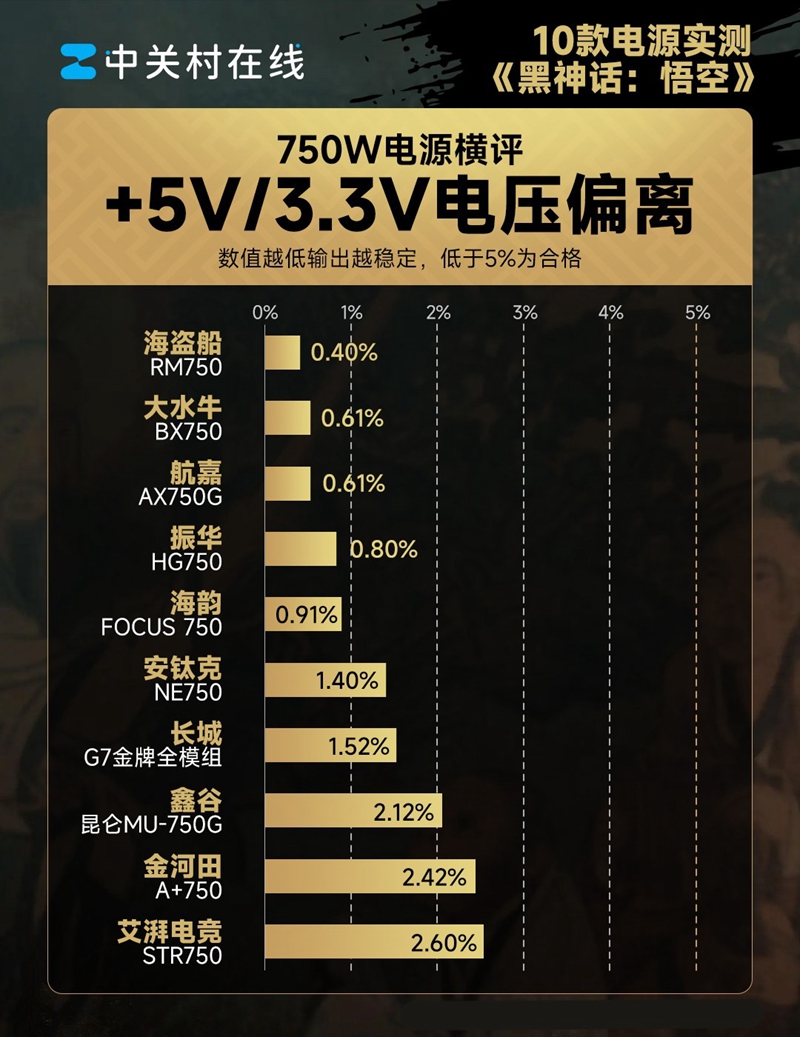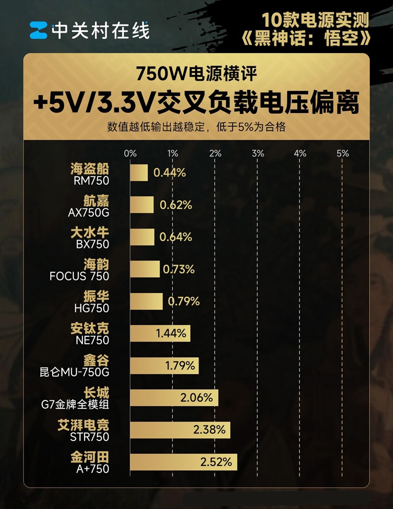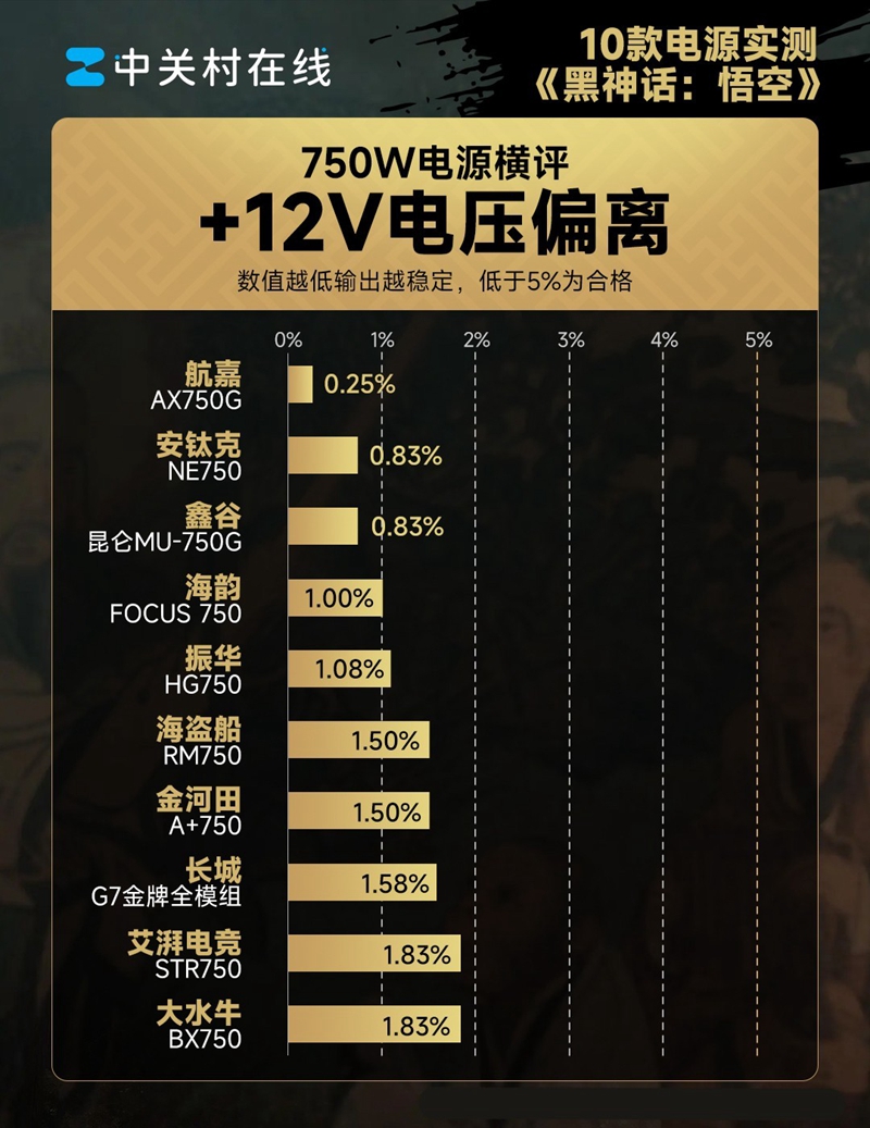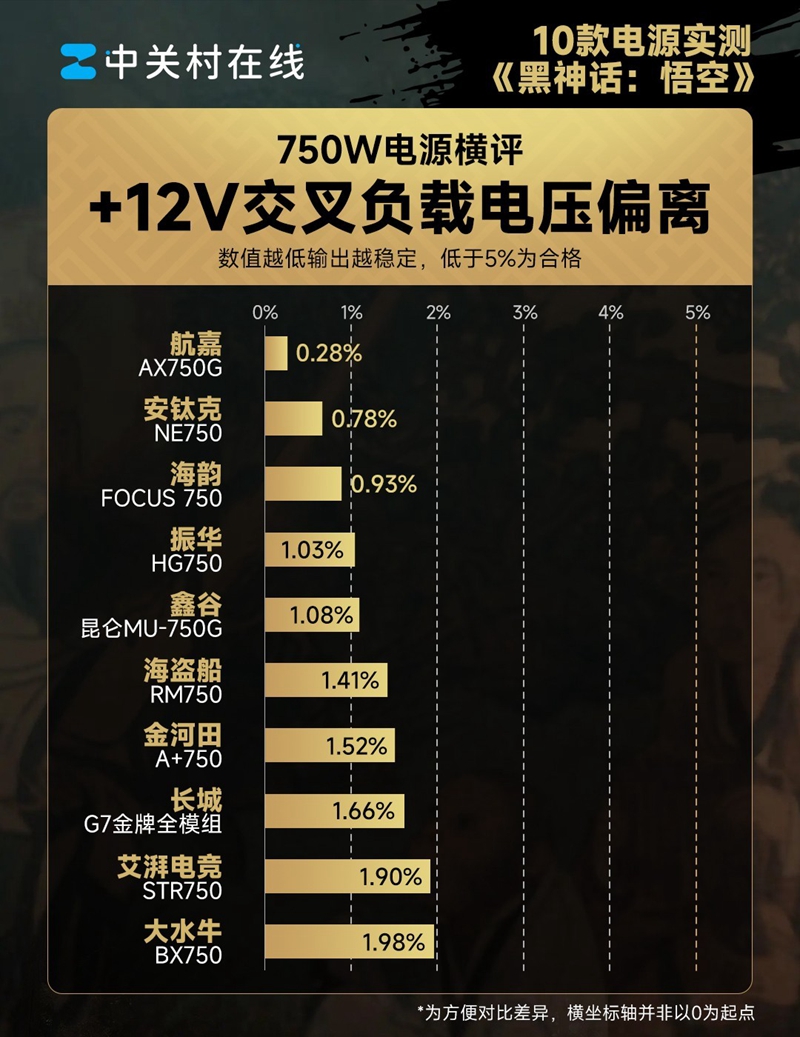 从测试的结果来看,电压偏离丝毫没有压力,参加横评的10款电源全数通过了测试。具体到每款产品的数据,航嘉AX750G的综合表现更好,各路输出都保持在1%的偏离幅度内,输出电压更稳定。