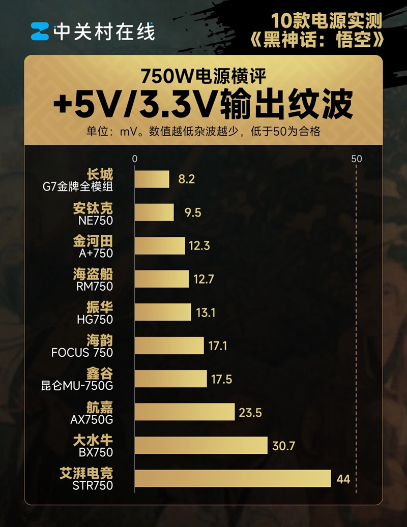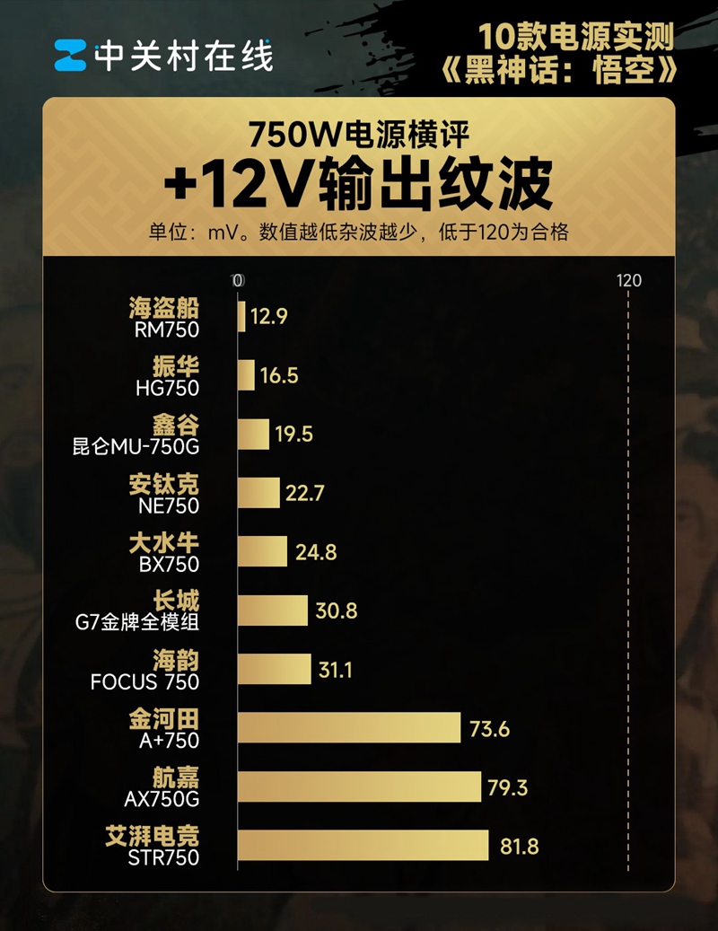 输出纹波的数值越小,意味着输出电流越纯净,对硬件的影响就越小。电源规范对+12V的纹波限值是120mV,+5V和+3.3V的纹波限值是50mV,本次横评也采用相同的要求。
