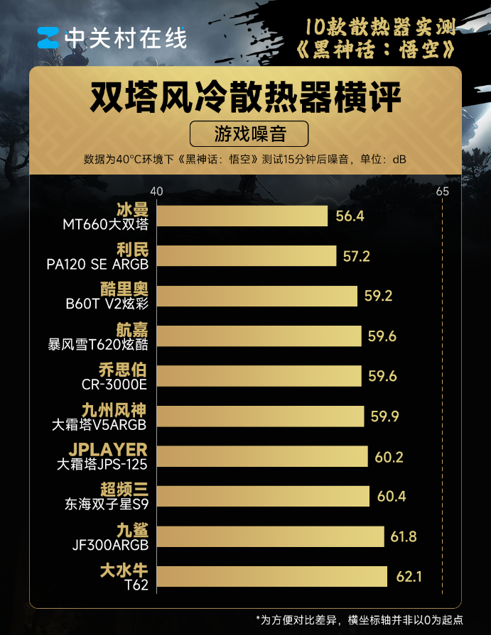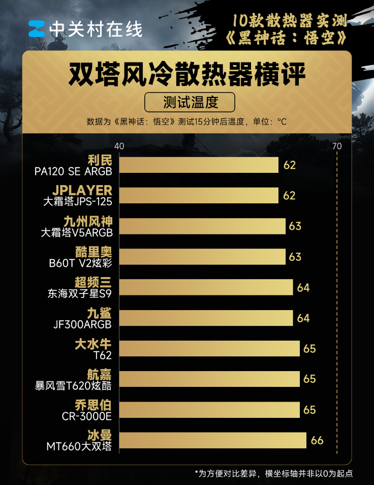 《黑神话:悟空》对CPU的占用并不高,所以散热压力也不大,这次测试的温度比AIDA64满载低了20℃,对散热器的压力也小了不少。具体来看,游戏测试的结果和AIDA64拷机的结果类似,利民PA120SE ARGB和JPLAYER大霜塔JPS-125的温度控制表现最好只有62℃,而温度最高的仍然是冰曼MT660大双塔。