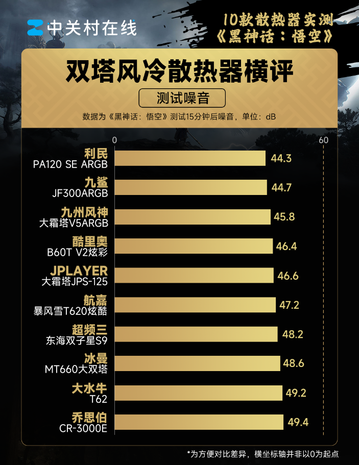 在噪音方面,游戏场景CPU的负载下降,所以散热器的压力减少,噪音也有所降低,不过仍然都超过了40分贝,有明显的感知,不过好消息是10款散热器的噪音都降至50分贝以下,上限低了不少。