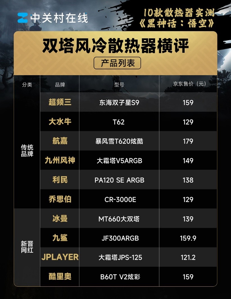 首先我们将产品列表展示如下,可以看到目前主流的双塔式风冷散热器价格没有拉开差距,传统的散热器厂商同样有较高的性价比,也出乎了我们的预料。