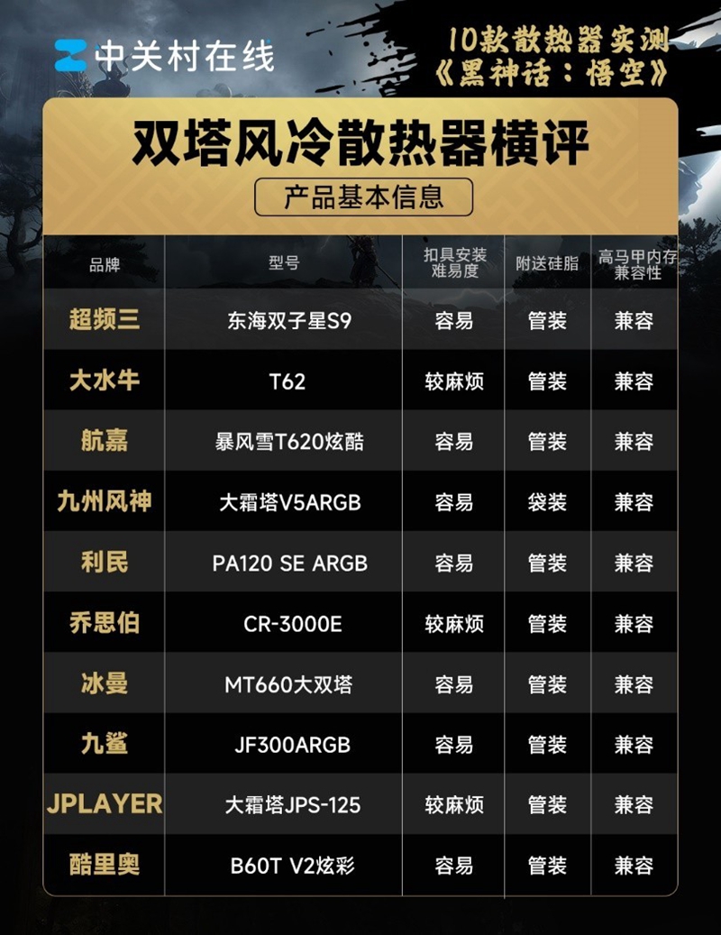 在进行测试之前,我们先将这10款散热器的基础信息进行对比,虽然很多玩家没有重视,但是细节方面的设计同样会影响使用体验。