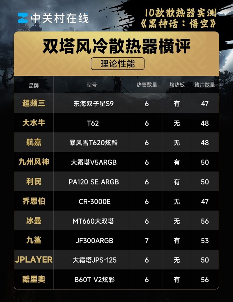 在实机测试之前,我们先对理论性能进行一下对比,双塔式风冷散热器普遍采用了6根6mm热管,本次横评的10款产品有9款采用了这样的设计,还有九鲨的JF300ARGB采用了7根热管,理论上会有更好的导热性能。