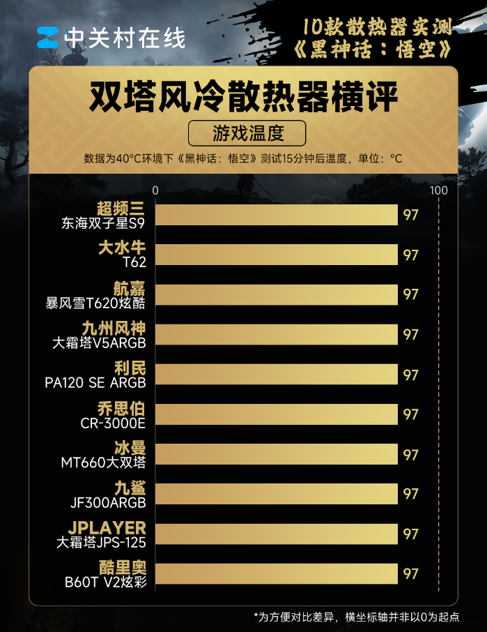 AIDA64测试的是在CPU满载下的散热器理论性能,在实际使用场景中,由于不同应用对CPU的占用不同,导致具体的表现也会有差异。我们就采用了时下流行的3A大作《黑神话:悟空》进行实机测试,来看看这10款散热器在游戏场景下的体验。