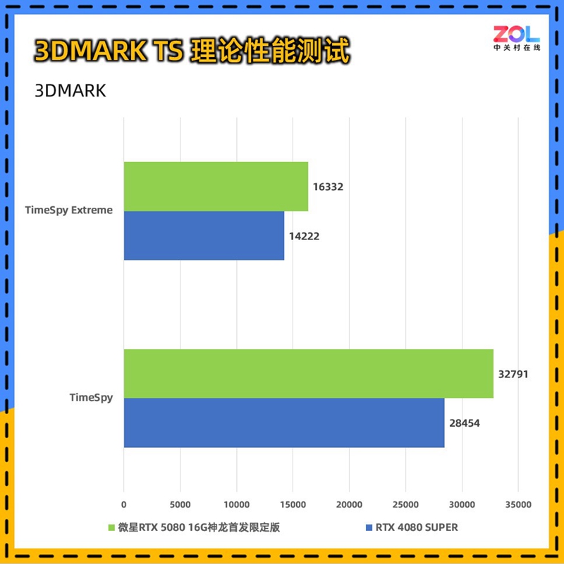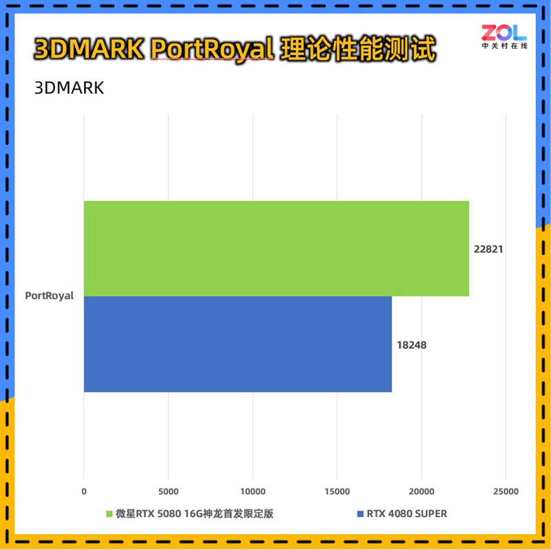 PortRoyal是3DMARK中专门针对光追性能的测试项,微星 RTX5080 16G神龙首发限定版相较RTX 4080 SUPER的提升约为25%。综合来看,微星 RTX5080 16G神龙首发限定版的理论性能相较RTX 4080 SUPER的提升约为19%。
