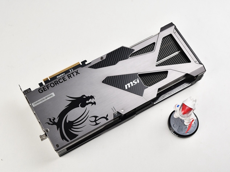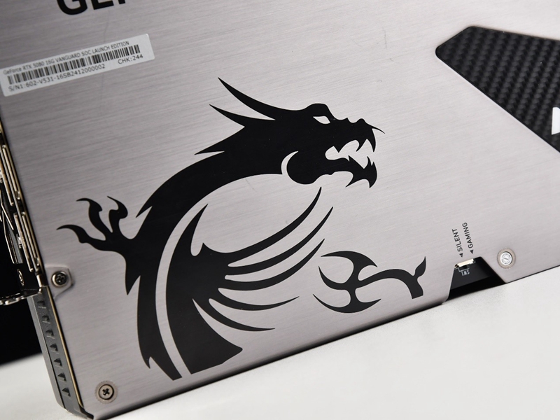 显卡背部为全尺寸的金属背板,左侧为微星龙的logo,右侧则是大面积的散热开孔,在保护背板强化显卡的同时还可以起到辅助散热的作用。金属背板左下方有一个小的双BIOS拨片开关,玩家可以在静音和性能之间进行切换。