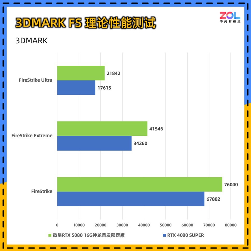 在针对显卡DX11性能的3DMARKFS套装测试中,微星 RTX5080 16G神龙首发限定版的提升对比RTX4080 SUPER,在三档分辨率中的提升分别为,12%/21%/24%,综合提升约为19%。