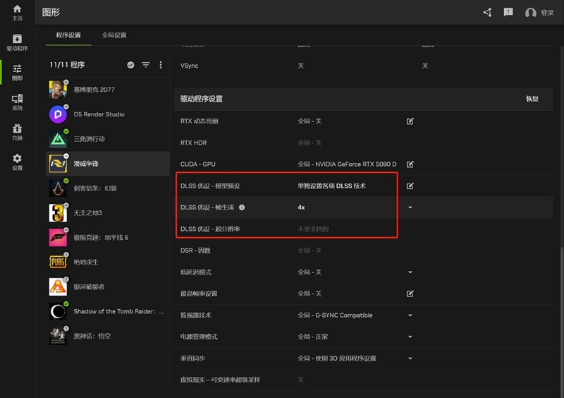 打开NVIDIA APP后,切换至图形选项卡,找到对应的游戏,拉至最下方,找到DLSS模型预设,将内部选项全部调节至最新后,开启DLSS帧生成4X,即可享受帧数的暴力加成。