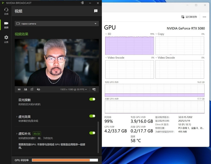 在新的NVIDIA Broadcast中,还增加了GPU利用率的显示,当软件中功能全部打开时,对于GPU的占用率还是非常高的,比较适合会议等不需要过多GPU参与的场景。而如果是游戏直播,则可适当关闭AI效果,以降低GPU利用率。