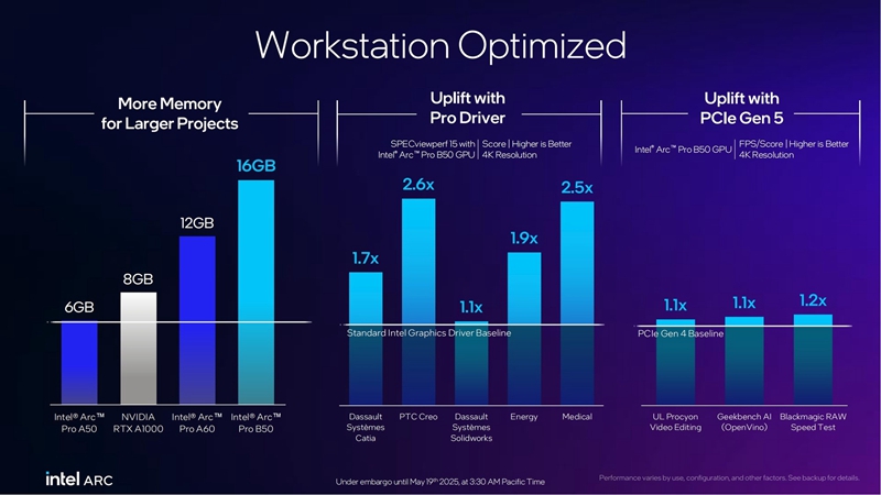 在更加细致的生产力相关图形性能方面以及推理性能方面,相比前代锐炫Pro A50以及NVIDIA RTX A1000来说,锐炫Pro B50代际提升幅度最高分别达到3.4倍和3.5倍。