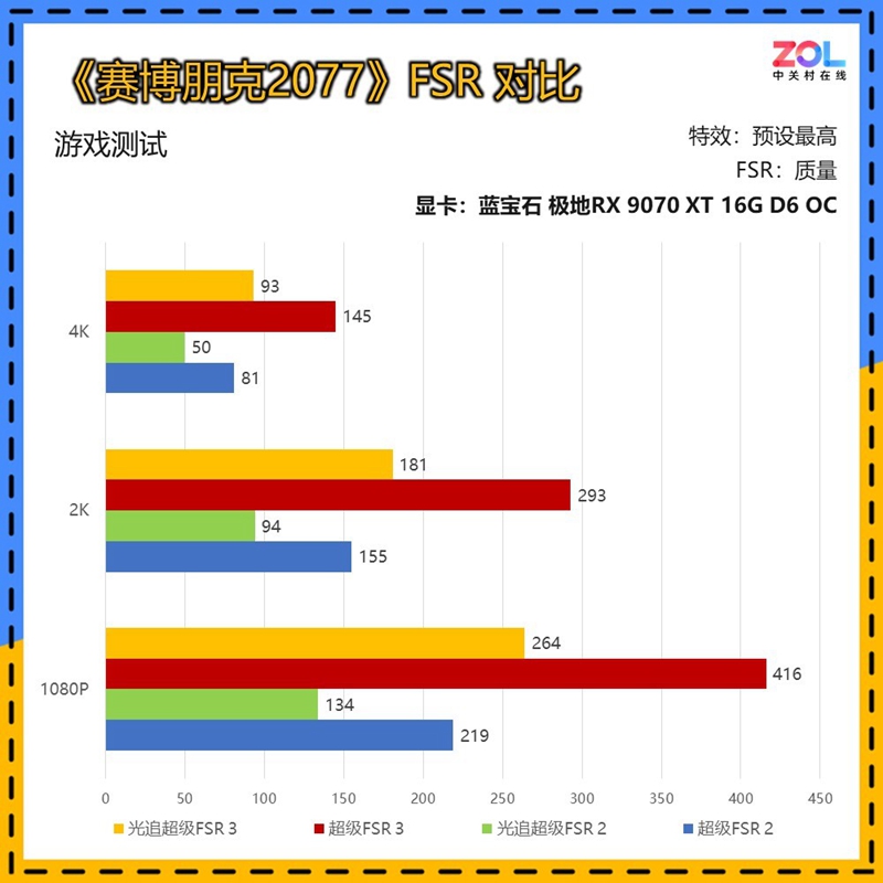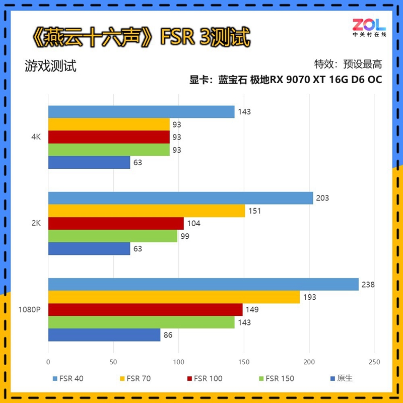 所有测试均开启FSR 帧生成,实测蓝宝石 极地RX 9070 XT 16G D6 OC在预设最高+光追最高的情况下,4K分辨率仍能达到109帧的成绩,对于一款RPG类游戏来说已经完全达到流畅游戏的标准。