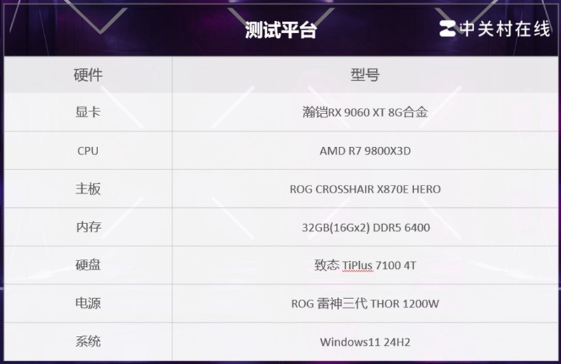 本次的测试平台我们选择了AMD R7 9800X3D,主板为ROGCROSSHAIRX870E HERO主板。
