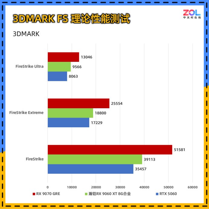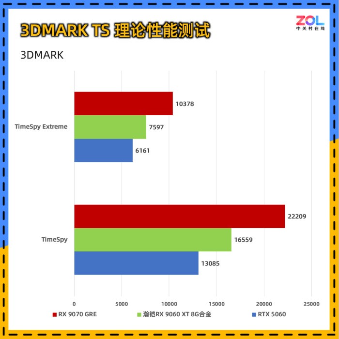 而在针对DX12环境下的Time Spy和Time Spy Extreme测试中,瀚铠RX 9060 XT 8G合金相较RTX 5060的提升分别为26%/23%,综合约为24%;与RX 9070 GRE的差距分别为25%/26%,综合约为25%。